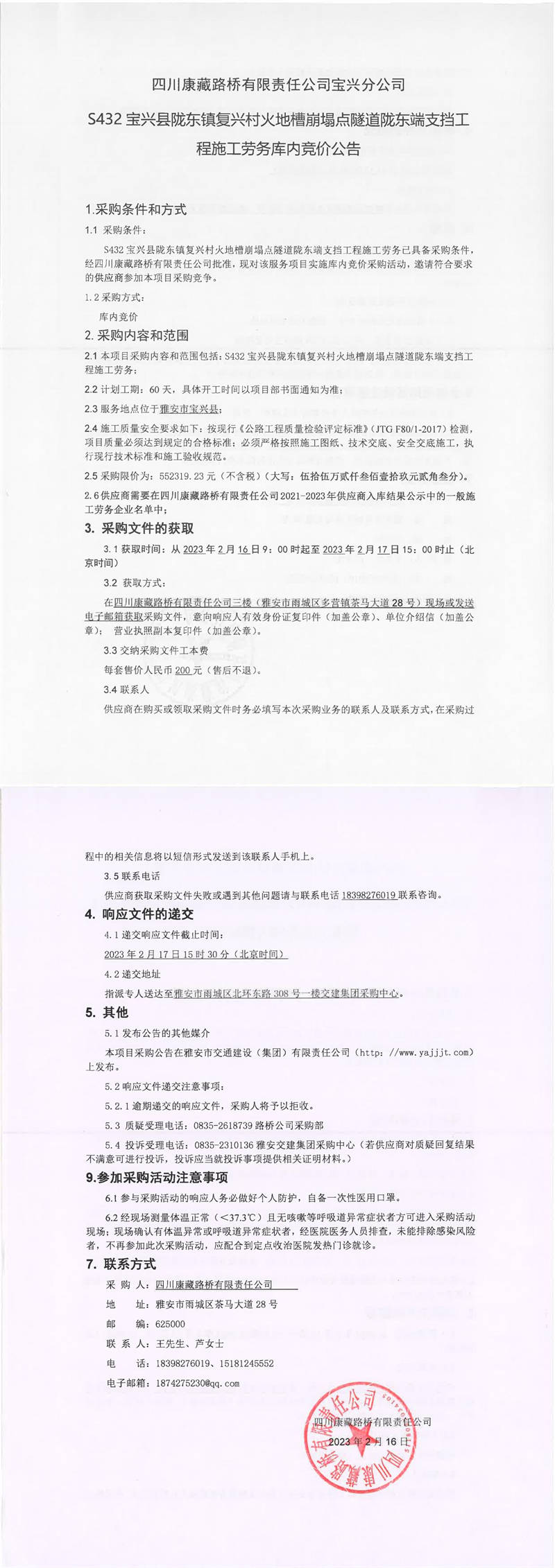 四川康藏路橋有限責任公司寶興分公司S432寶興縣隴東鎮(zhèn)復興村火地槽崩塌點隧道隴東端支擋工程施工勞務庫內(nèi)競價公告