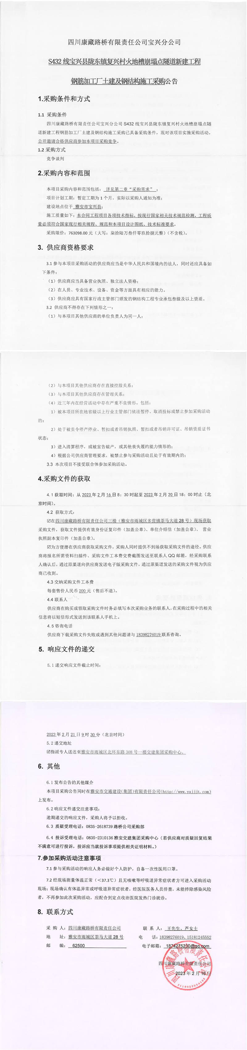 四川康藏路橋有限責任公司寶興分公司S432線寶興縣隴東鎮(zhèn)復(fù)興村火地槽崩塌點隧道新建工程鋼筋加工廠土建及鋼結(jié)構(gòu)施工采購公告