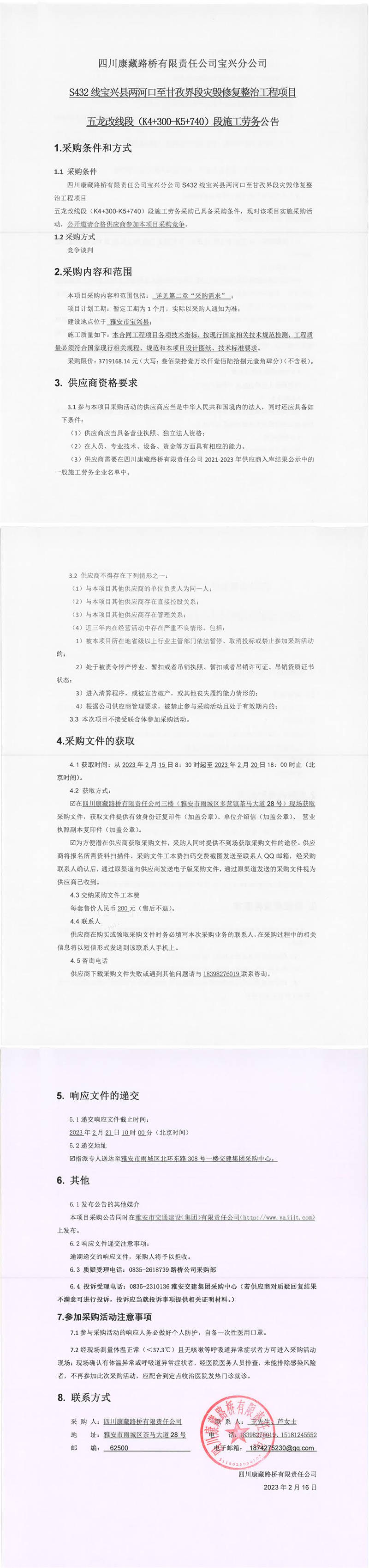 四川康藏路橋有限責(zé)任公司S432線寶興縣兩河口至甘孜界段災(zāi)毀修復(fù)整治工程項目五龍改線段(K4+300-K5+740)段施工勞務(wù)公告