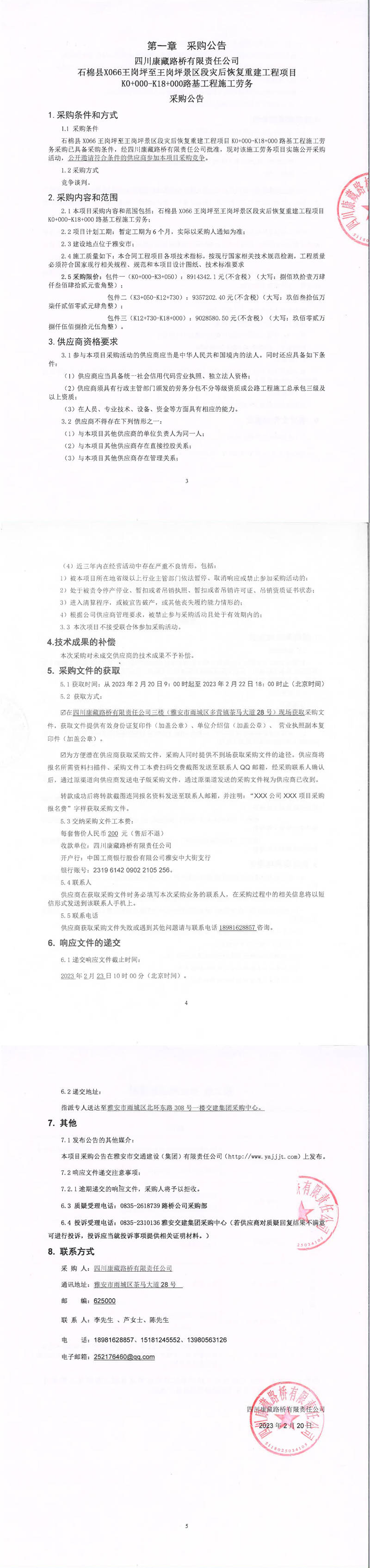 四川康藏路橋有限責任公司石棉縣X066王崗坪至王崗坪景區(qū)段災(zāi)后恢復(fù)重建工程項目土石方工程、排水工程、邊坡治理工程、防護工程施工勞務(wù)采購公告