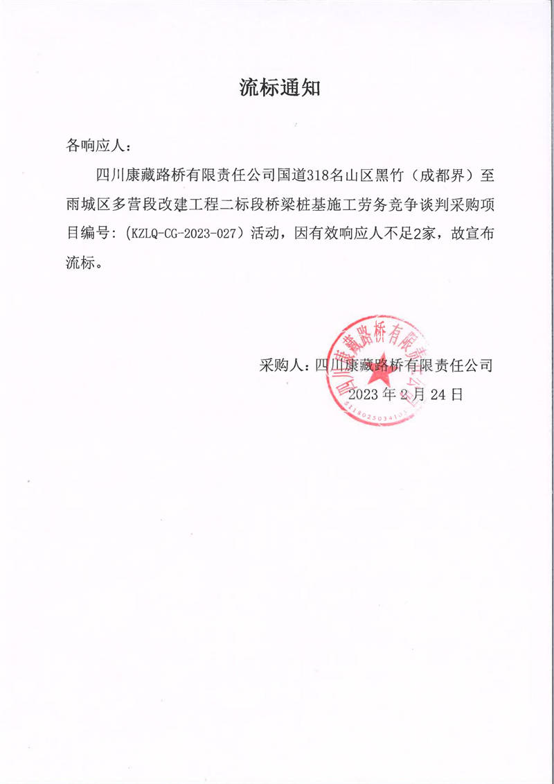 四川康藏路橋有限責(zé)任公司國(guó)道318名山區(qū)黑竹(成都界)至雨城區(qū)多營(yíng)段改建工程二標(biāo)段橋梁樁基施工勞務(wù)競(jìng)爭(zhēng)談判采購(gòu)流標(biāo)通知