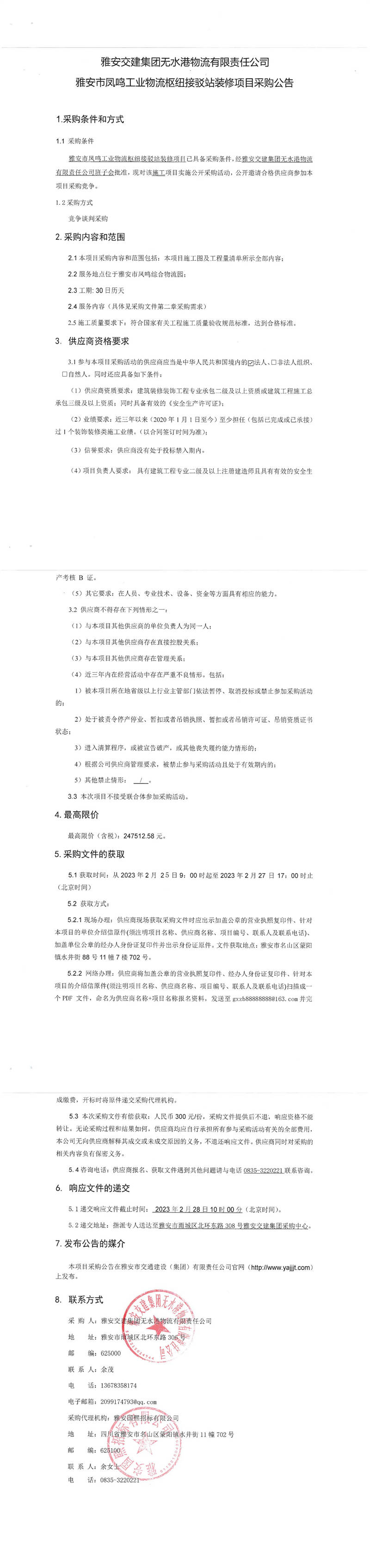 雅安交建集團(tuán)無水港物流有限責(zé)任公司雅安市鳳鳴工業(yè)物流樞紐接駁站裝修項(xiàng)目采購(gòu)公告