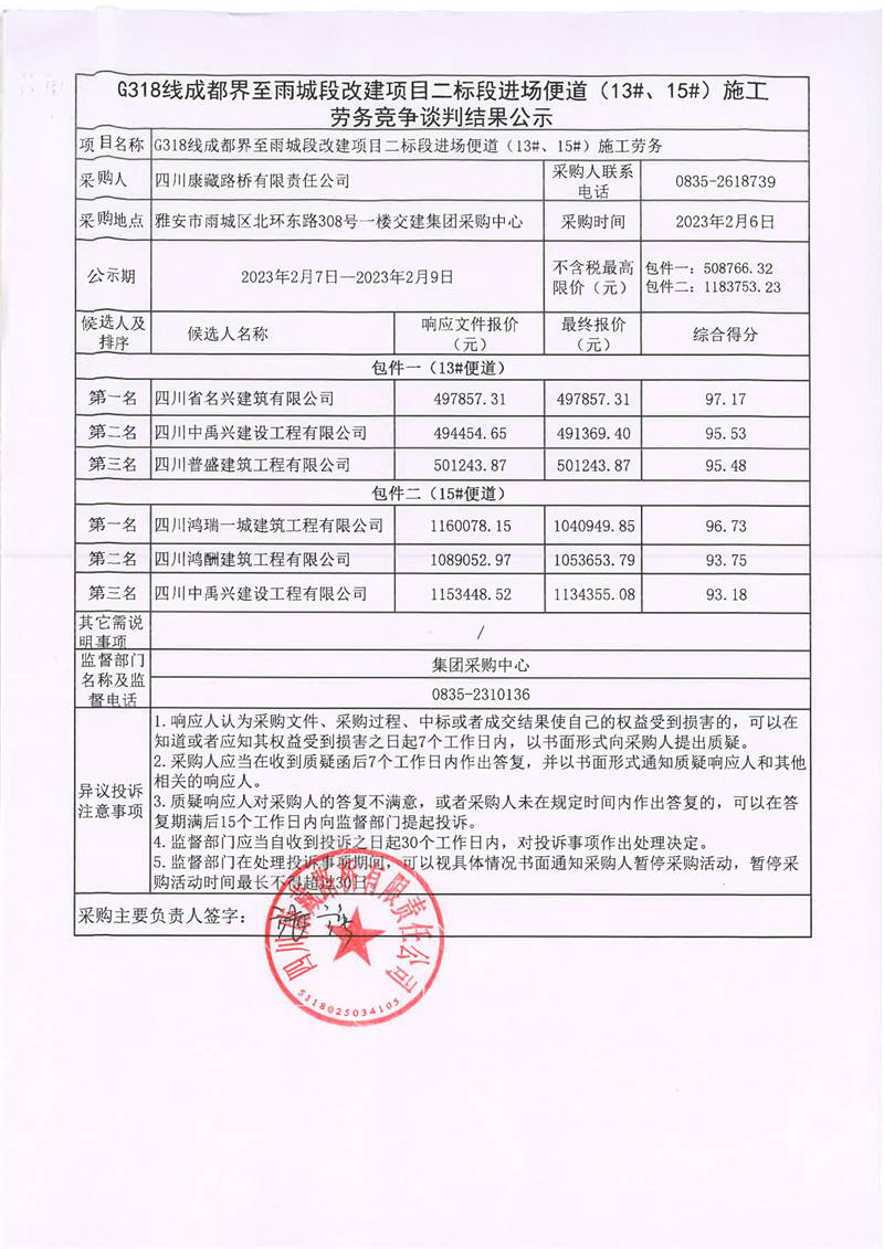 四川康藏路橋有限責(zé)任公司G318線成都界至雨城段改建項目二標(biāo)段進場便道(13#、15#)施工勞務(wù)競爭談判結(jié)果公示