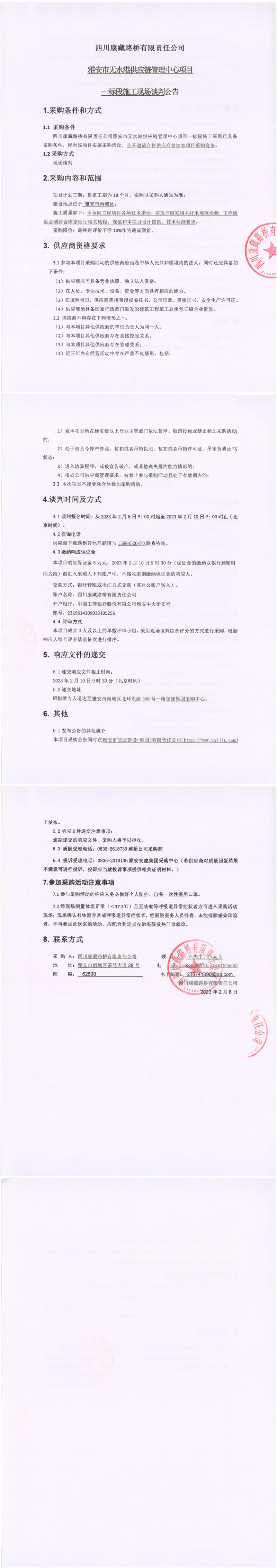 四川康藏路橋有限責任公司雅安市無水港供應鏈管理中心項目一標段施工現場談判公告