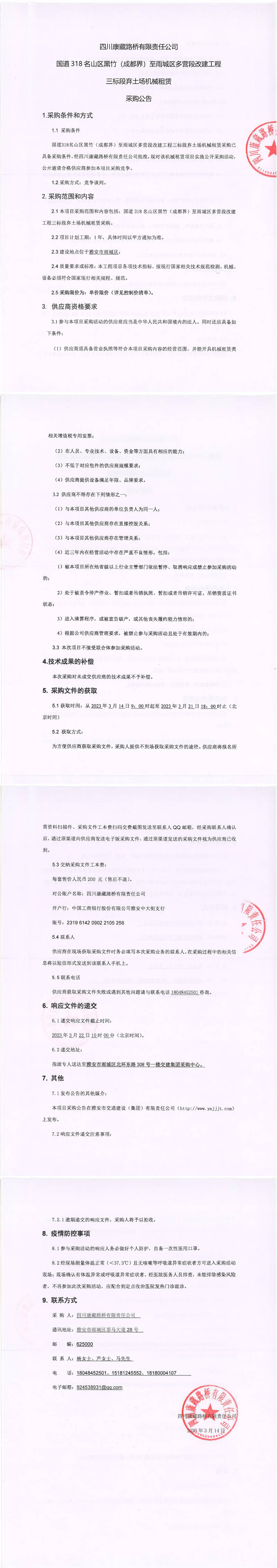 四川康藏路橋有限責(zé)任公司國(guó)道318名山區(qū)黑竹(成都界)至雨城區(qū)多營(yíng)段改建工程三標(biāo)段棄土場(chǎng)機(jī)械租賃采購(gòu)公告