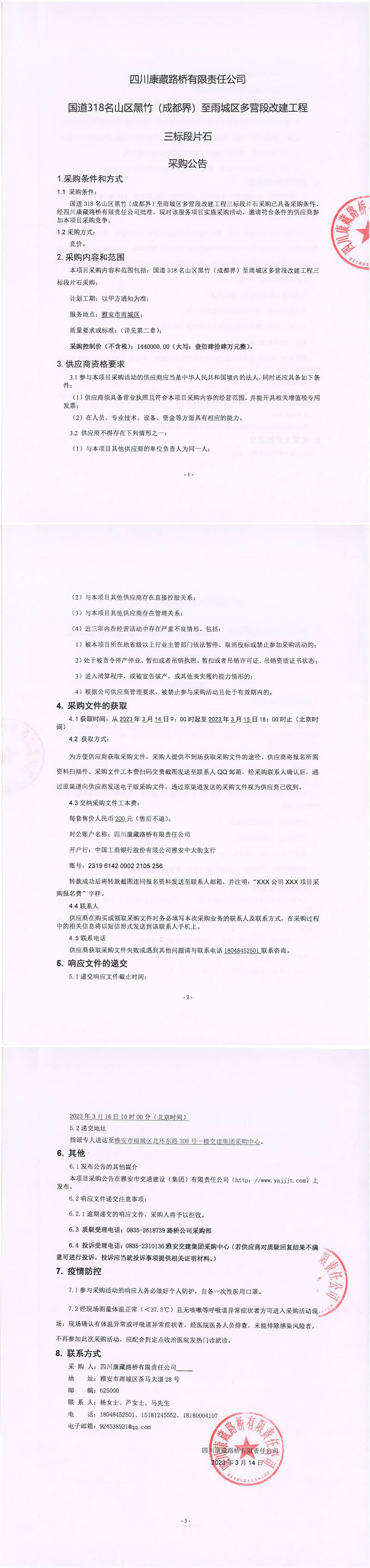 四川康藏路橋有限責(zé)任公司國道318名山區(qū)黑竹(成都界)至雨城區(qū)多營段改建工程三標段片石采購公告