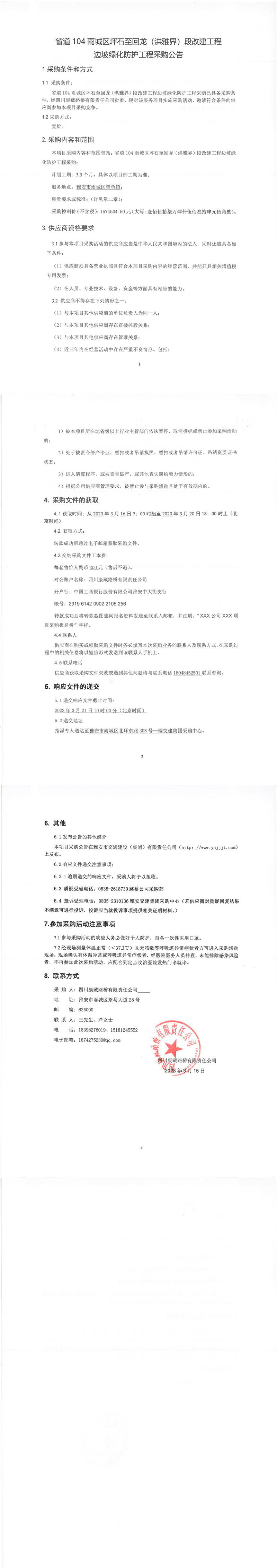 四川康藏路橋有限責(zé)任公司省道104雨城區(qū)坪石至回龍(洪雅界)段改建工程邊坡綠化防護(hù)工程采購(gòu)公告