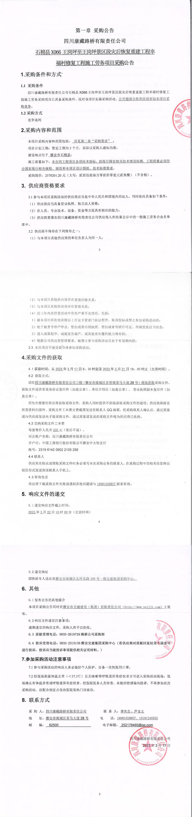 四川康藏路橋有限責(zé)任公司石棉縣X066王崗坪至王崗坪景區(qū)段災(zāi)后恢復(fù)重建工程幸福村修復(fù)工程施工勞務(wù)項(xiàng)目采購(gòu)公告