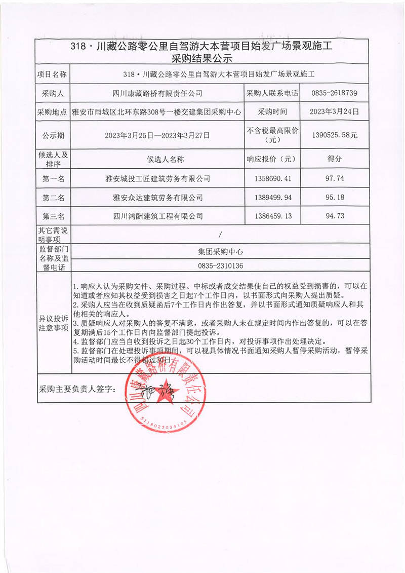 四川康藏路橋有限責任公司318·川藏公路零公里自駕游大本營項目始發(fā)廣場景觀施工采購結(jié)果公示