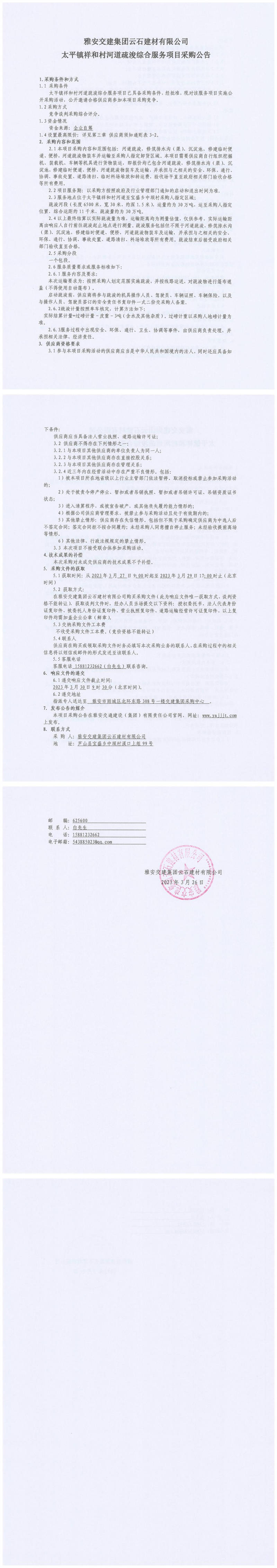 雅安交建集團(tuán)云石建材有限公司太平鎮(zhèn)祥和村河道疏浚綜合服務(wù)項(xiàng)目采購公告