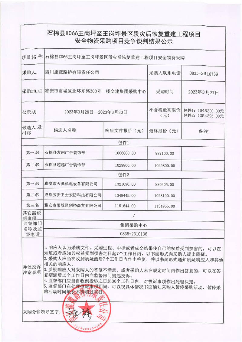 四川康藏路橋有限責任公司石棉縣X066王崗坪至王崗坪景區(qū)段災后恢復重建工程項目安全物資采購項目競爭談判結果公示
