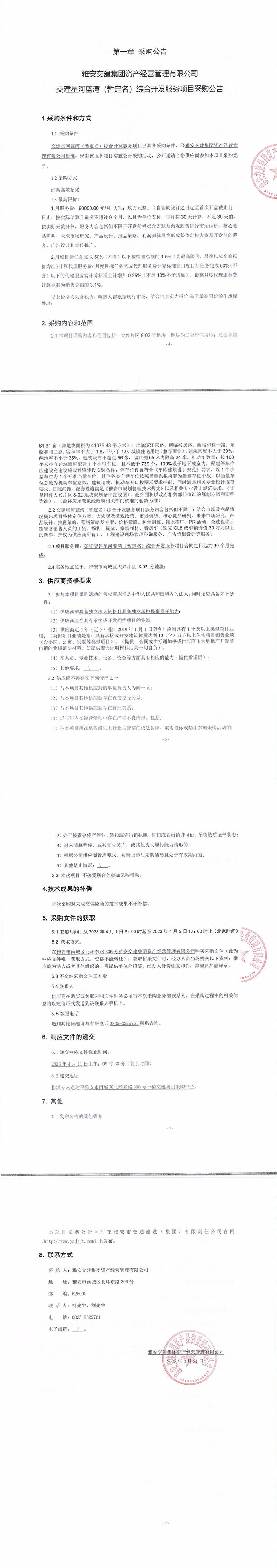 雅安交建集團(tuán)資產(chǎn)經(jīng)營管理有限公司交建星河藍(lán)灣(暫定名)綜合開發(fā)服務(wù)項目采購公告