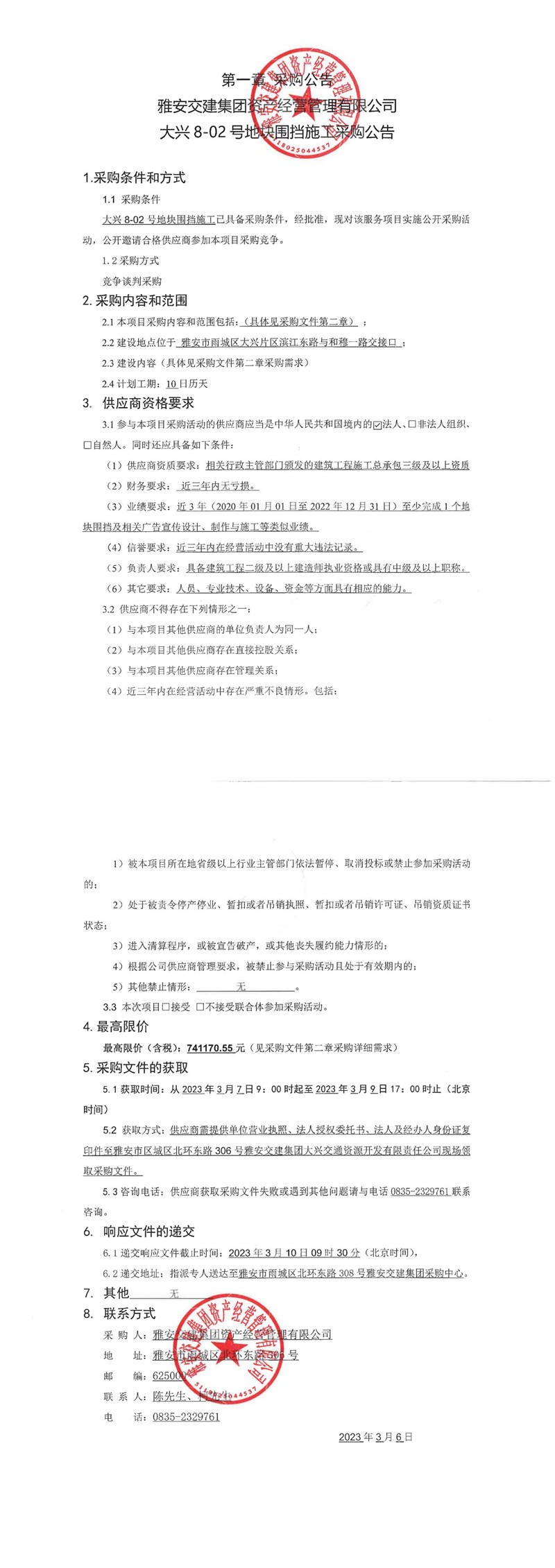 雅安交建集團(tuán)資產(chǎn)經(jīng)營管理有限公司大興8-02號(hào)地塊圍擋施工采購公告