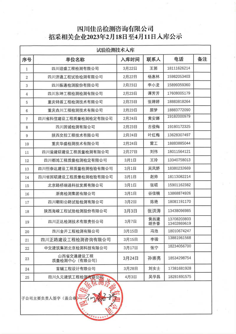 四川佳岳檢測咨詢有限公司(試驗(yàn)檢測技術(shù)供應(yīng)商庫)2023年2月18日至4月11日入庫結(jié)果公示