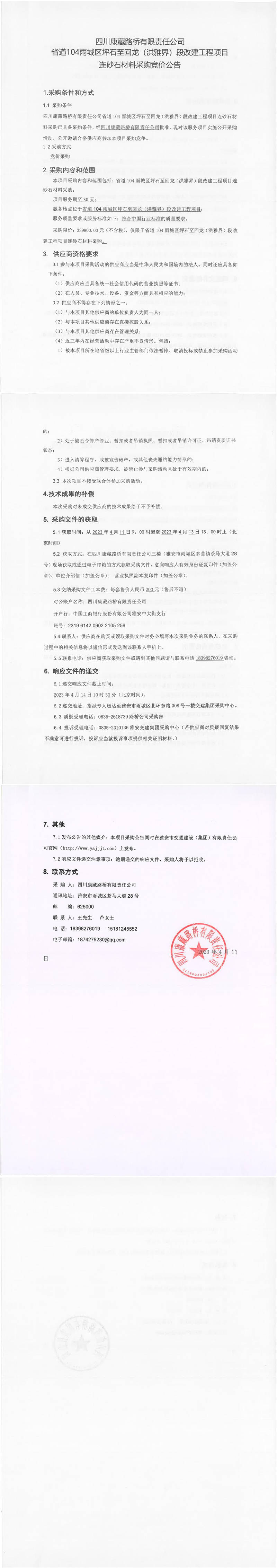 四川康藏路橋有限責任公司省道104雨城區(qū)坪石至回龍(洪雅界)段改建工程項目連砂石材料采購競價公告