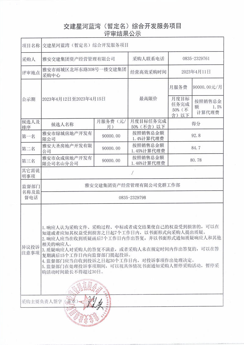 雅安交建集團資產(chǎn)經(jīng)營管理有限公司交建星河藍(lán)灣(暫定名)綜合開發(fā)服務(wù)項目評審結(jié)果公示