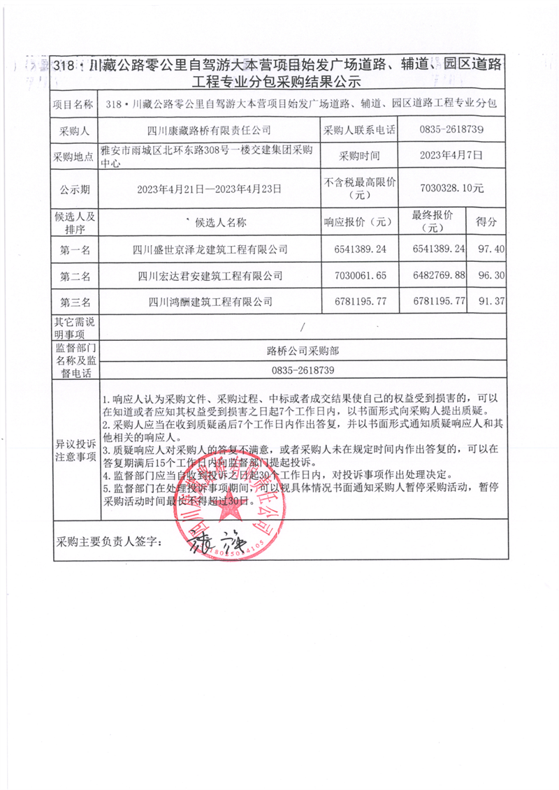 四川康藏路橋有限責(zé)任公司318·川藏公路零公里自駕游大本營項(xiàng)目始發(fā)廣場(chǎng)道路、輔道、園區(qū)道路工程專業(yè)分包采購結(jié)果公示