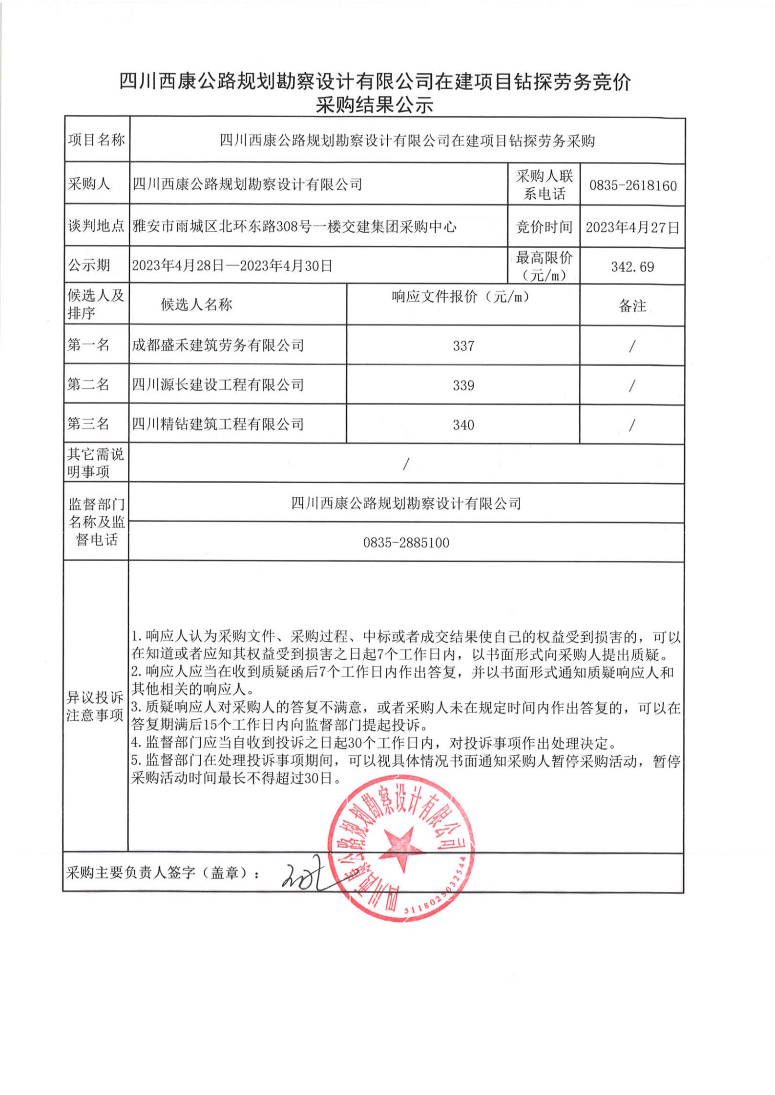 四川西康公路規(guī)劃勘察設計公司在建項目鉆探勞務競價采購結(jié)果公示