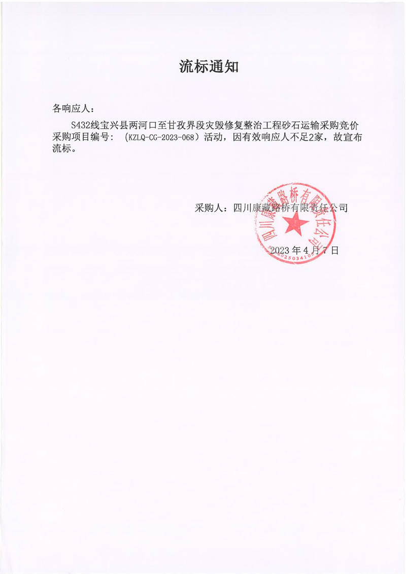四川康藏路橋有限責(zé)任公司寶興分公司S432寶興縣兩河口至甘孜界段災(zāi)毀修復(fù)整治工程砂石運輸采購流標(biāo)通知