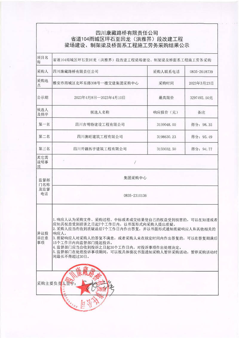 四川康藏路橋有限責(zé)任公司省道104雨城區(qū)坪石至回龍(洪雅界)段改建工程梁場(chǎng)建設(shè)、制架梁及橋面系工程施工勞務(wù)采購結(jié)果公示