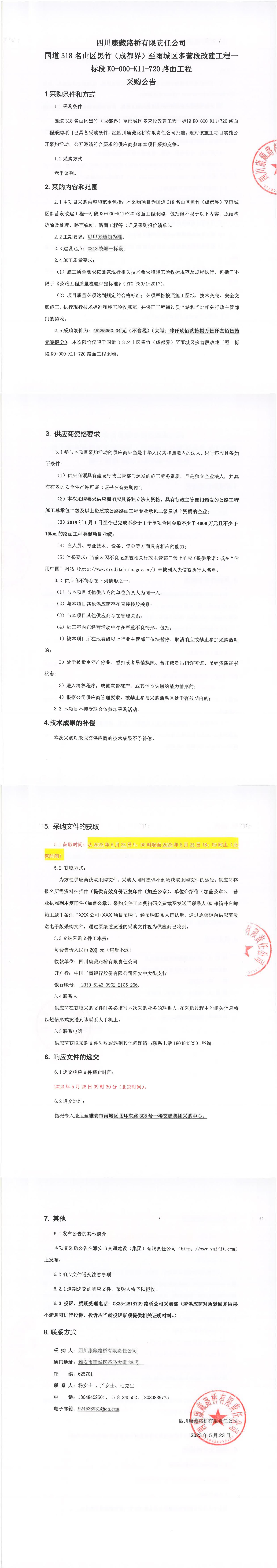 四川康藏路橋有限責(zé)任公司國道318名山區(qū)黑竹(成都界)至雨城區(qū)多營段改建工程一標(biāo)段K0+000-K11+720路面工程采購公告