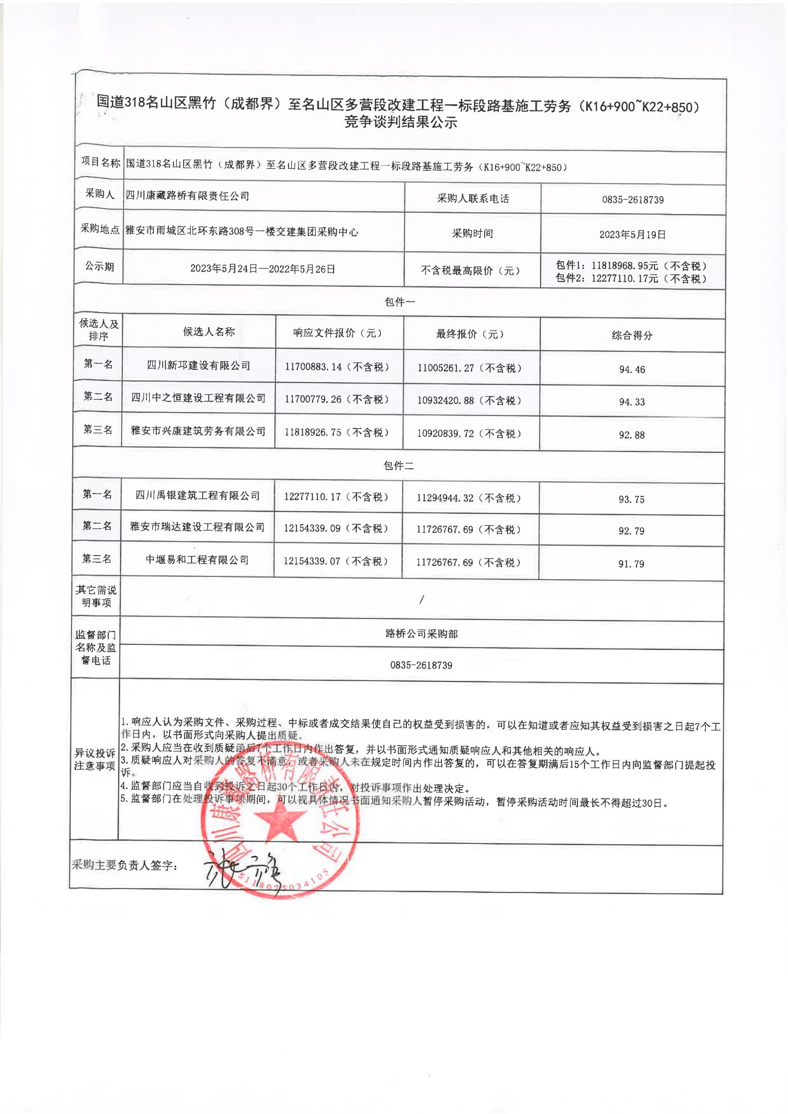 四川康藏路橋有限責(zé)任公司國道318名山區(qū)黑竹(成都界)至雨城區(qū)多營段改建工程一標段路基施工勞務(wù)(K16+900~K22+850)競爭談判結(jié)果公示