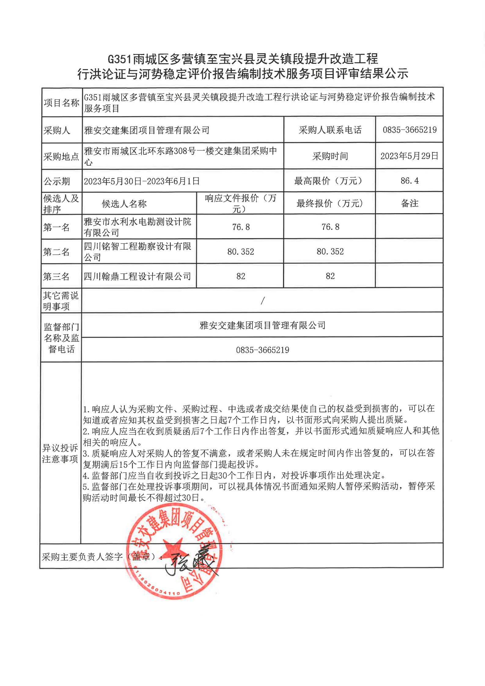 雅安交建集團項目管理有限公司G351雨城區(qū)多營鎮(zhèn)至寶興縣靈關(guān)鎮(zhèn)段提升改造工程行洪論證與河勢穩(wěn)定評價報告編制技術(shù)服務(wù)項目評審結(jié)果公示