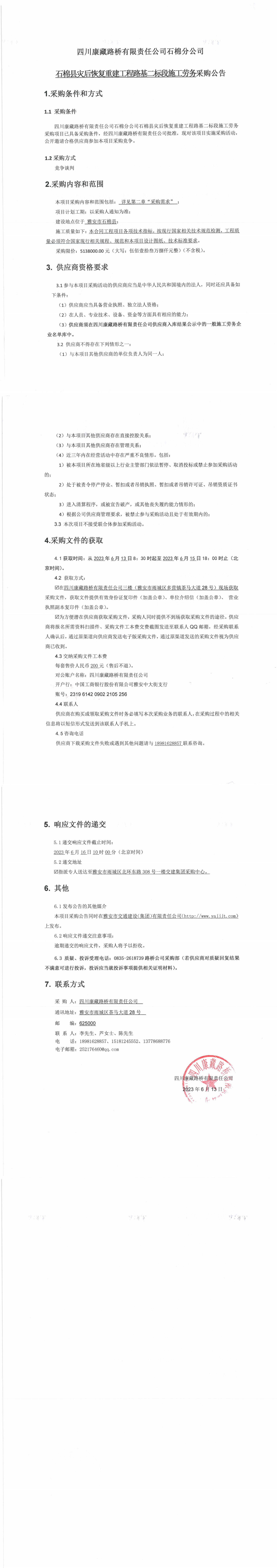 四川康藏路橋有限責(zé)任公司石棉分公司石棉縣災(zāi)后恢復(fù)重建工程路基二標段施工勞務(wù)采購公告
