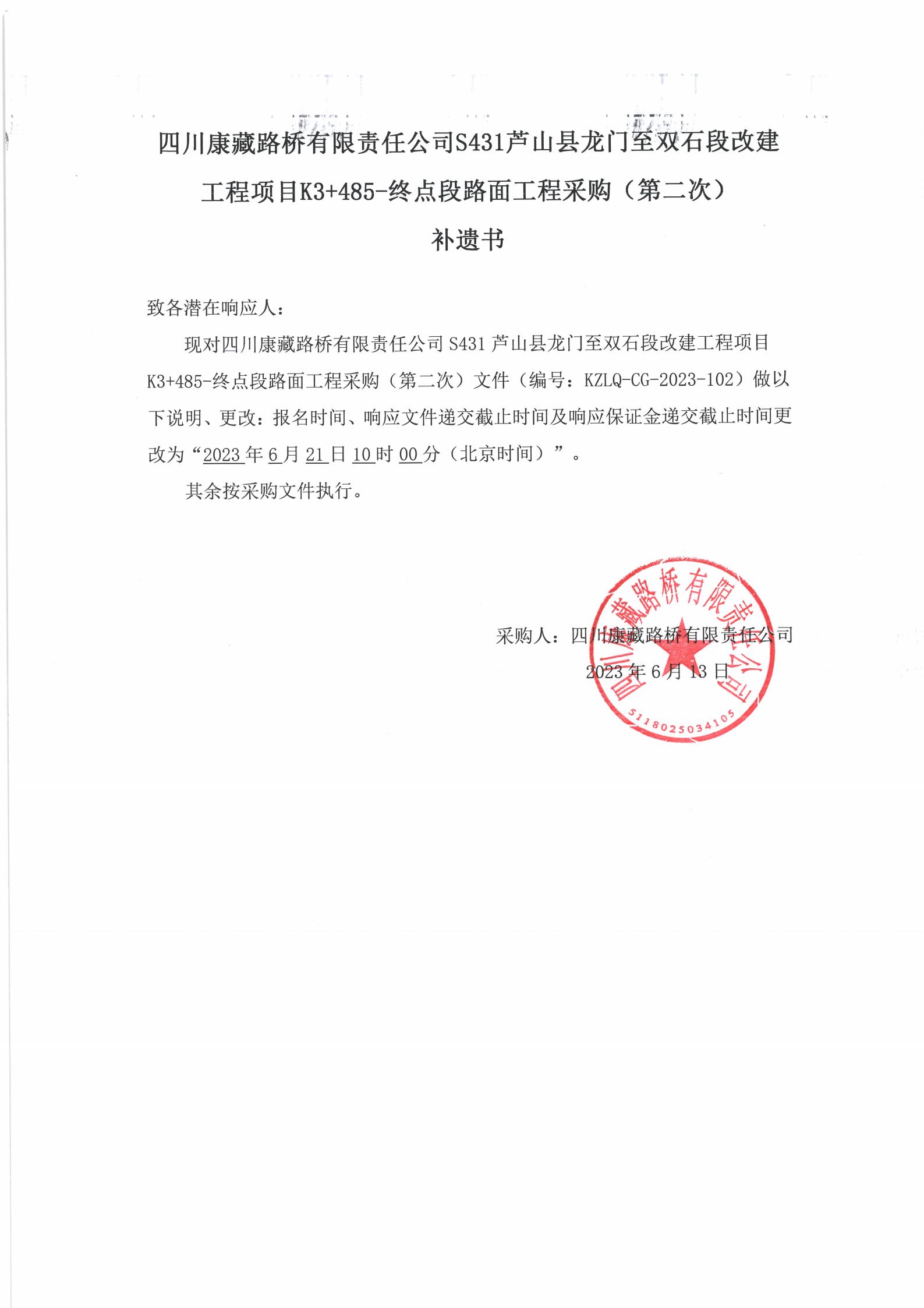 四川康藏路橋有限責(zé)任公司S431蘆山縣龍門至雙石段改建工程項目K3+485-終點段路面工程采購(第二次)補(bǔ)遺書