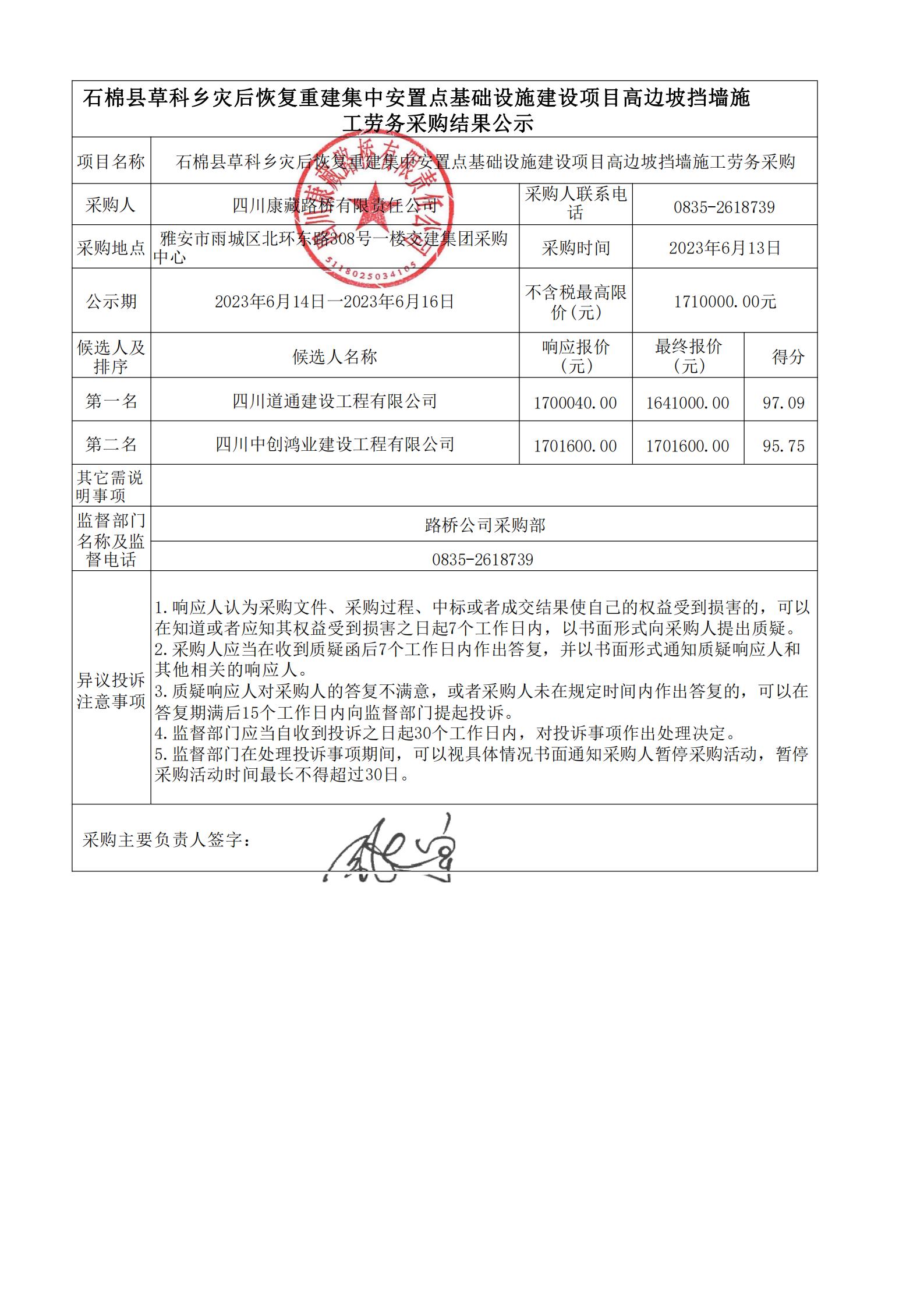 四川康藏路橋有限責任公司石棉縣草科鄉(xiāng)災后恢復重建集中安置點基礎設施建設項目高邊坡?lián)鯄κ┕趧詹少徑Y(jié)果公示