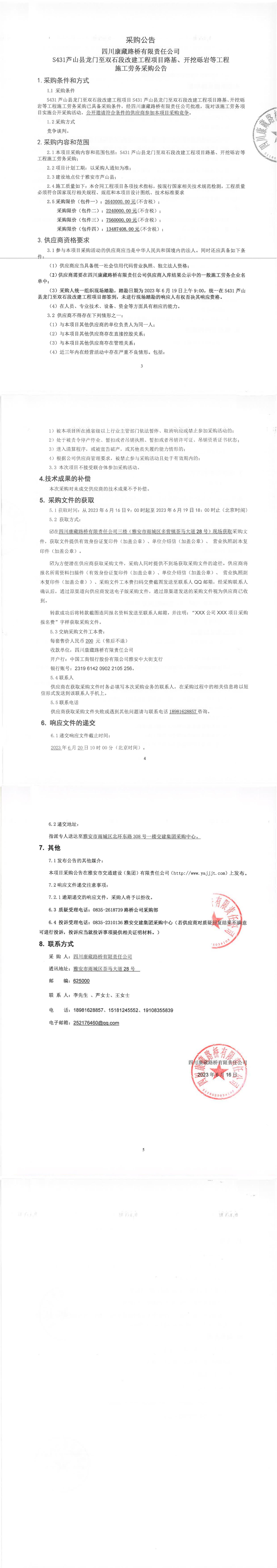 四川康藏路橋有限責任公司S431蘆山縣龍門至雙石段改建工程項目路基、開挖礫巖等工程施工勞務采購公告