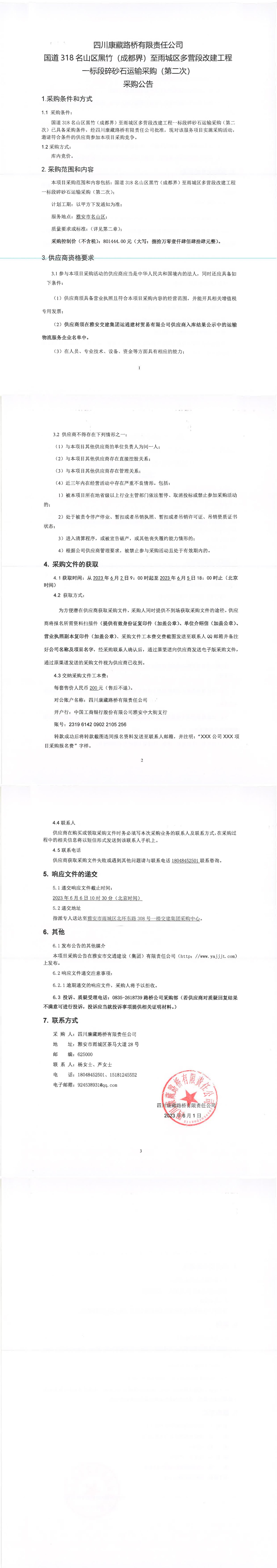四川康藏路橋有限責(zé)任公司國道318名山區(qū)黑竹(成都界)至雨城區(qū)多營段改建工程一標(biāo)段碎砂石運(yùn)輸采購(第二次)采購公告