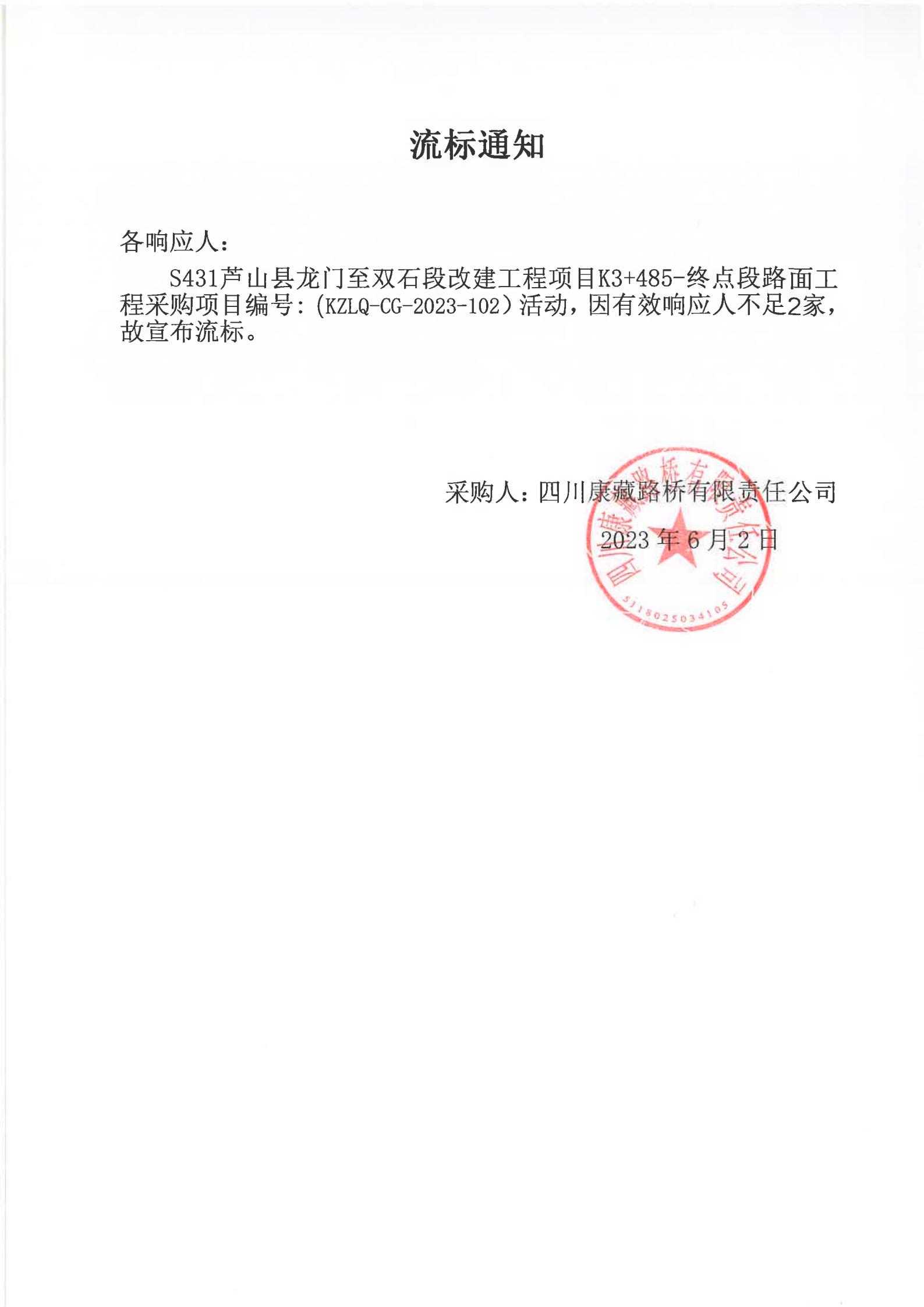 四川康藏路橋有限責(zé)任公司S431蘆山縣龍門(mén)至雙石段改建工程項(xiàng)目K3+485-終點(diǎn)段路面工程采購(gòu)項(xiàng)目流標(biāo)通知
