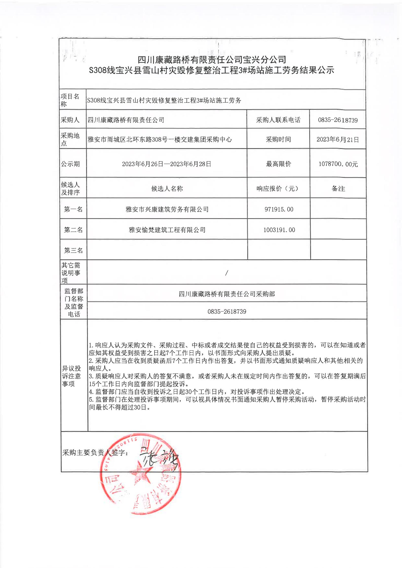 四川康藏路橋有限責任公司寶興分公司S308線寶興縣雪山村段災毀修復整治工程3#場站施工勞務結(jié)果公示