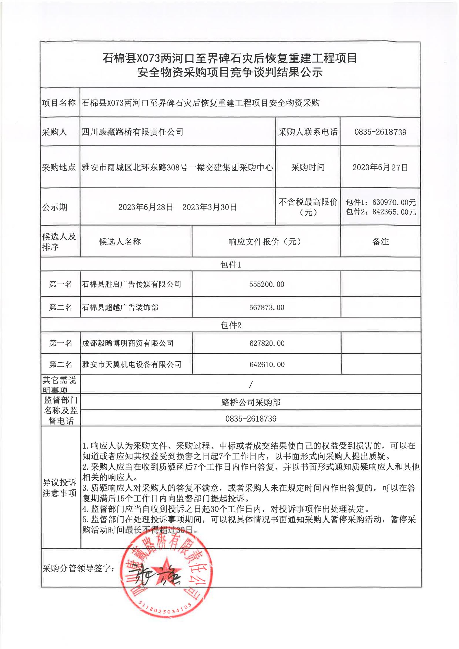 四川康藏路橋有限責(zé)任公司石棉縣X073兩河口至界碑石災(zāi)后恢復(fù)重建工程項(xiàng)目安全物資采購項(xiàng)目競爭談判結(jié)果公示