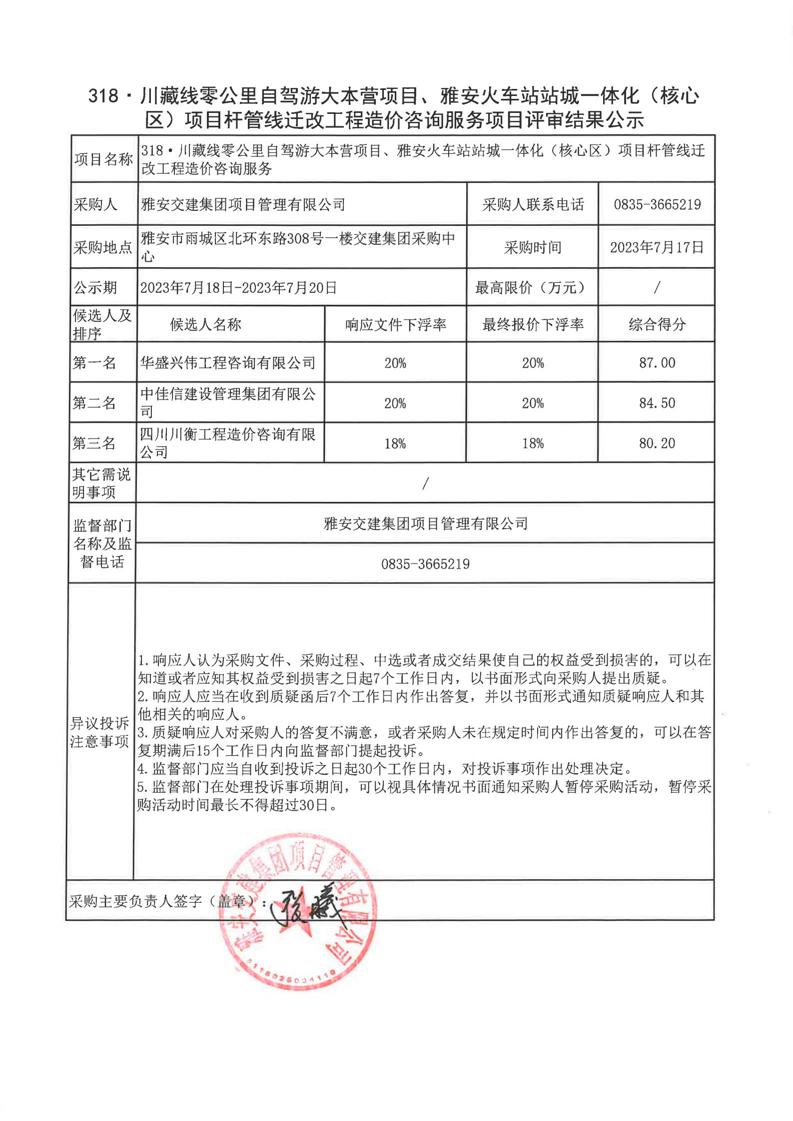 雅安交建集團(tuán)項(xiàng)目管理有限公司318·川藏公路零公里自駕游大本營項(xiàng)目、雅安火車站站城一體化(核心區(qū))項(xiàng)目桿管線遷改工程造價(jià)咨詢服務(wù)項(xiàng)目評(píng)審結(jié)果公示