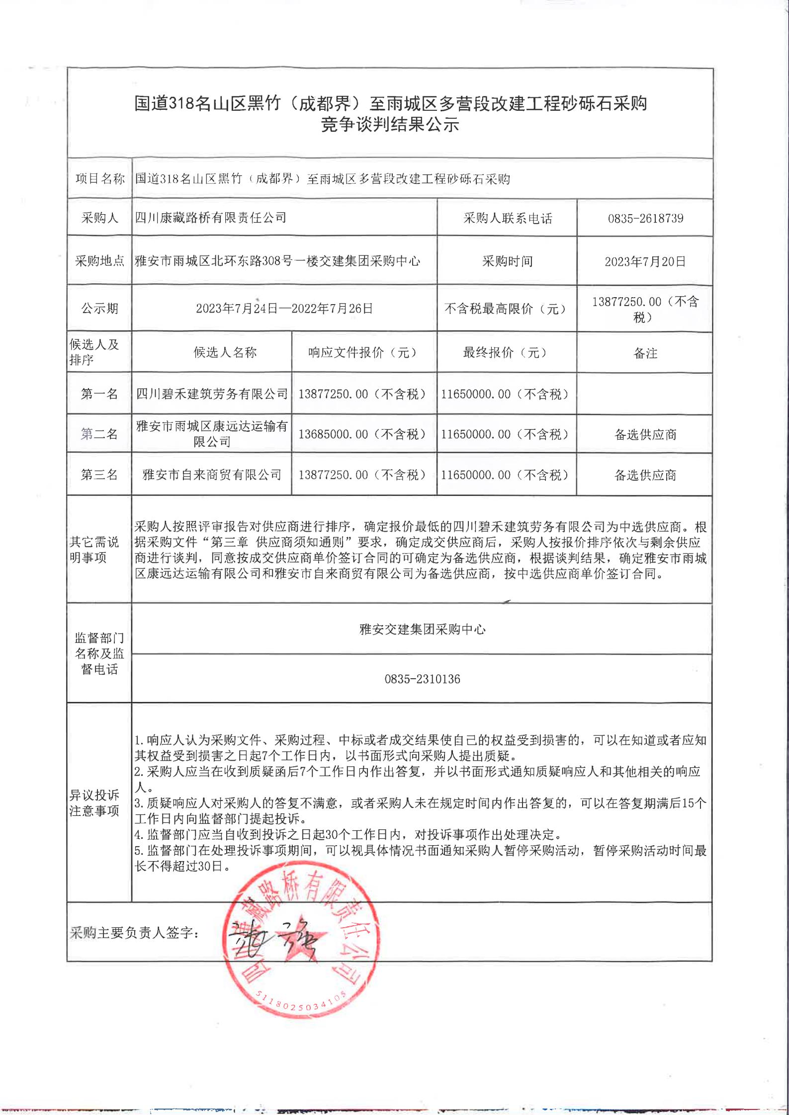 四川康藏路橋有限責(zé)任公司國道318名山區(qū)黑竹(成都界)至雨城區(qū)多營段改建工程砂礫石采購競(jìng)爭(zhēng)談判結(jié)果公示