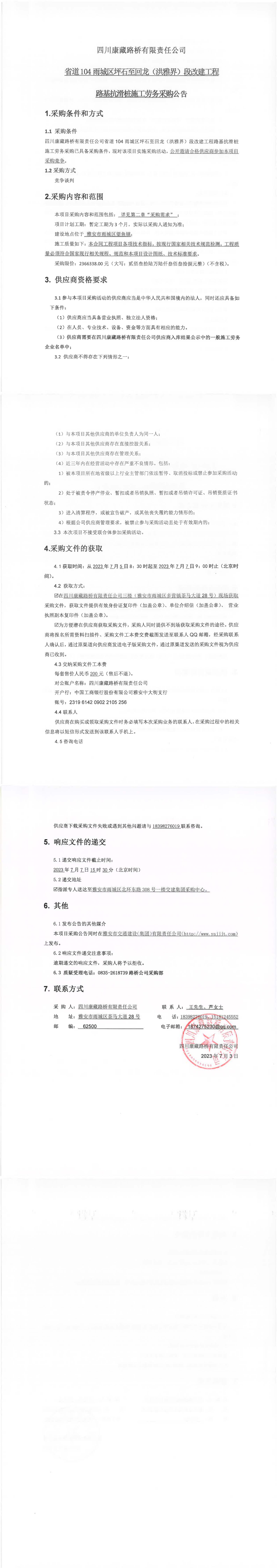 四川康藏路橋有限責(zé)任公司省道104雨城區(qū)坪石至回龍(洪雅界)段改建工程路基抗滑樁施工勞務(wù)采購公告
