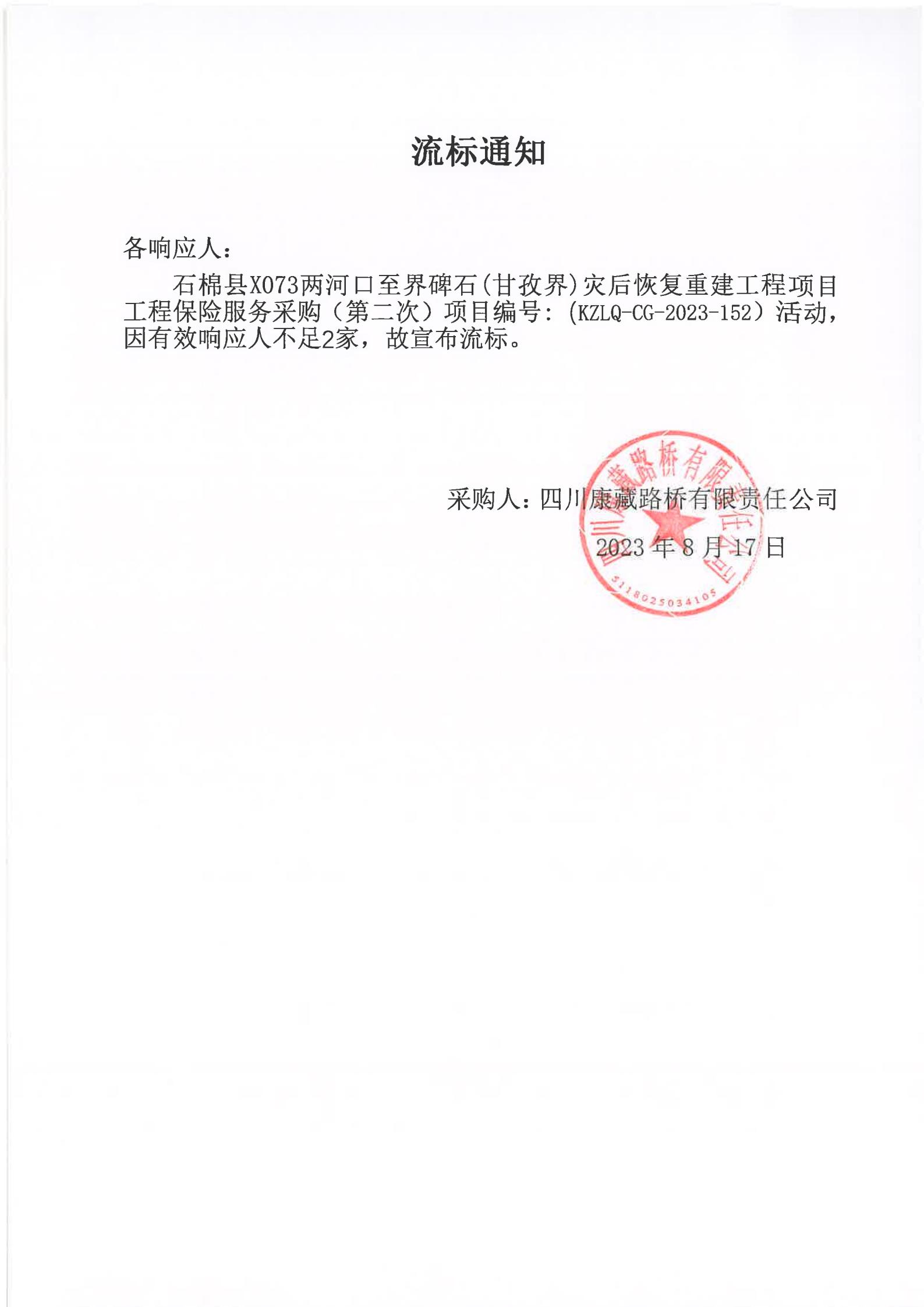 四川康藏路橋有限責(zé)任公司石棉縣X073兩河口至界碑石(甘孜界)災(zāi)后恢復(fù)重建工程項(xiàng)目工程保險(xiǎn)服務(wù)采購(gòu)(第二次)流標(biāo)通知
