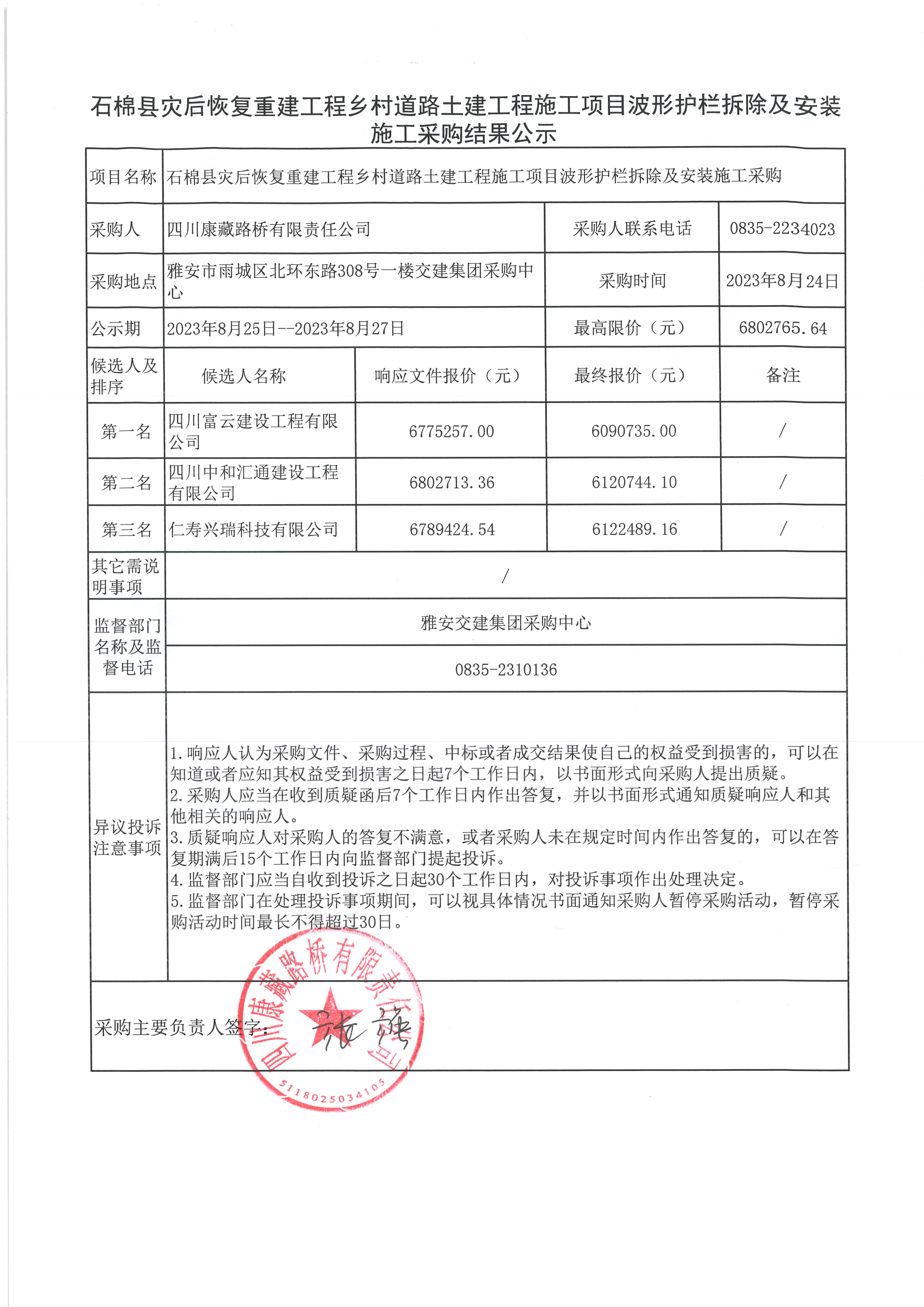 石棉縣災后恢復重建工程鄉(xiāng)村道路土建工程施工項目波形護欄拆除及安裝施工采購結(jié)果公示