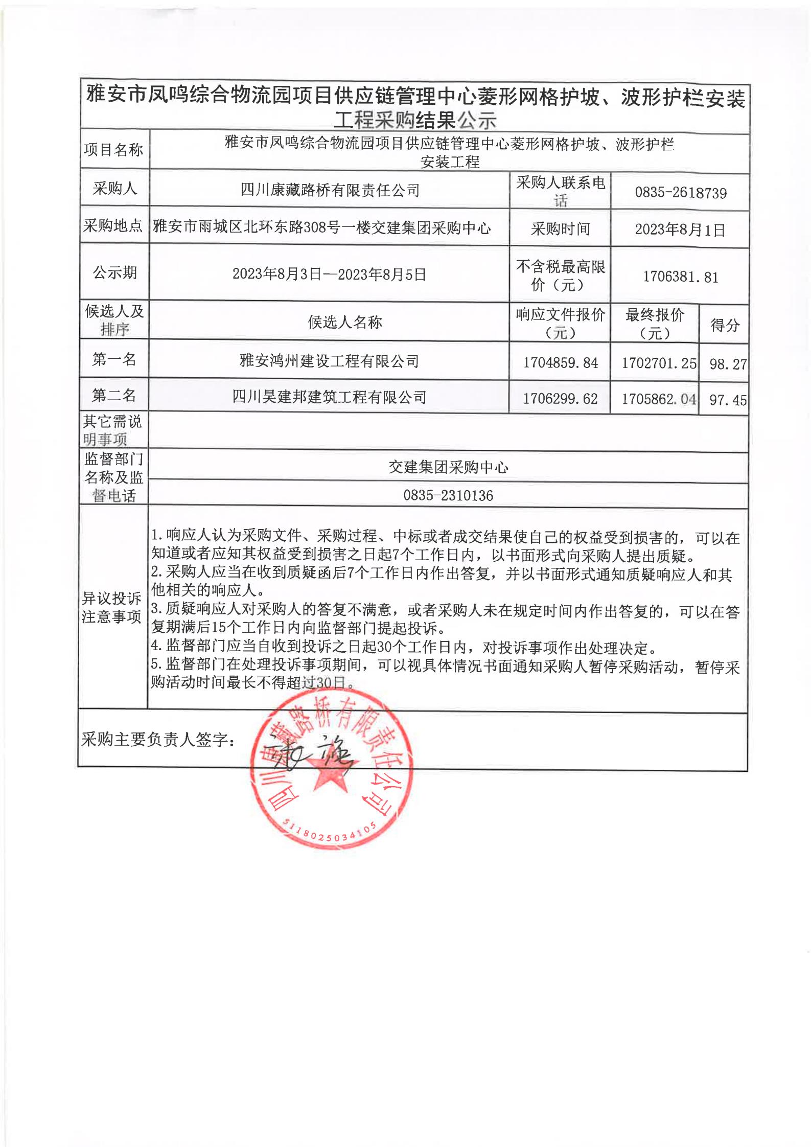 四川康藏路橋有限責(zé)任公司雅安市鳳鳴綜合物流園項目供應(yīng)鏈管理中心菱形網(wǎng)格護坡、波形護欄安裝工程采購結(jié)果公示