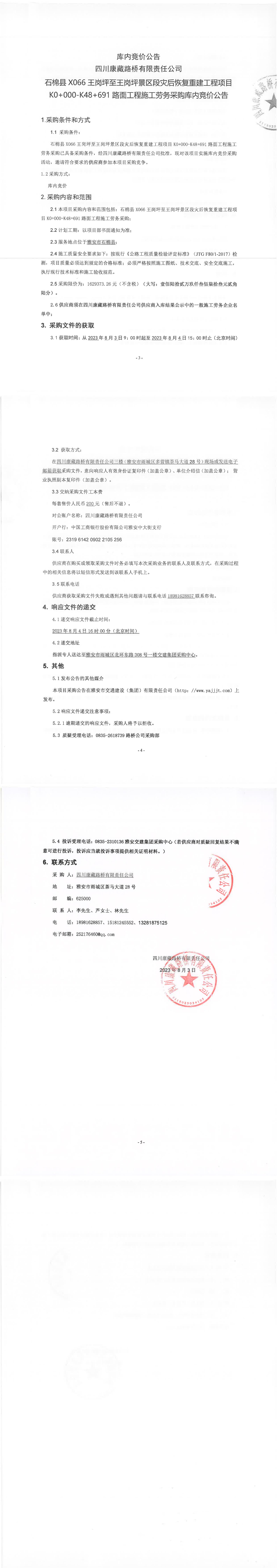 四川康藏路橋有限責任公司石棉縣X066王崗坪至王崗坪景區(qū)段災后恢復重建工程項目K0+000-K48+691路面工程施工勞務采購庫內(nèi)競價公告