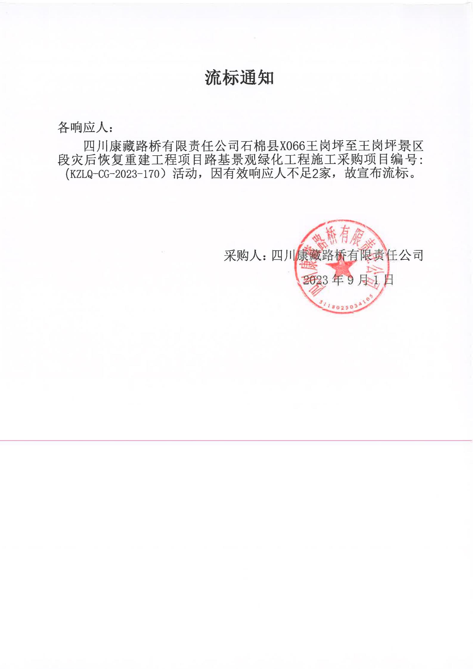 四川康藏路橋有限責任公司石棉縣X066王崗坪至王崗坪景區(qū)段災(zāi)后恢復(fù)重建工程項目路基景觀綠化工程施工采購流標通知
