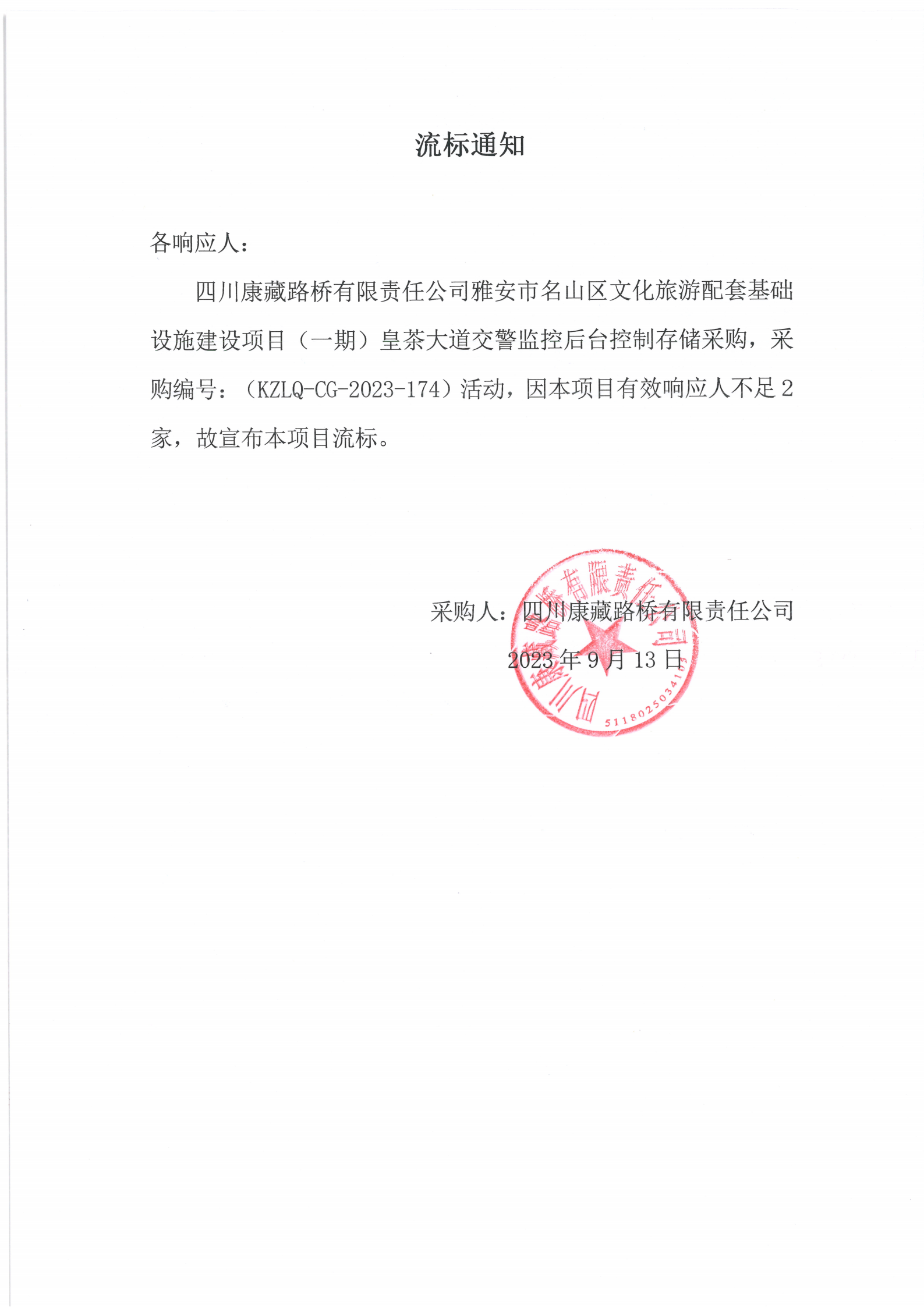 四川康藏路橋有限責任公司雅安市名山區(qū)文化旅游配套基礎設施建設項目(一期)皇茶大道交警監(jiān)控后臺控制存儲采購流標通知