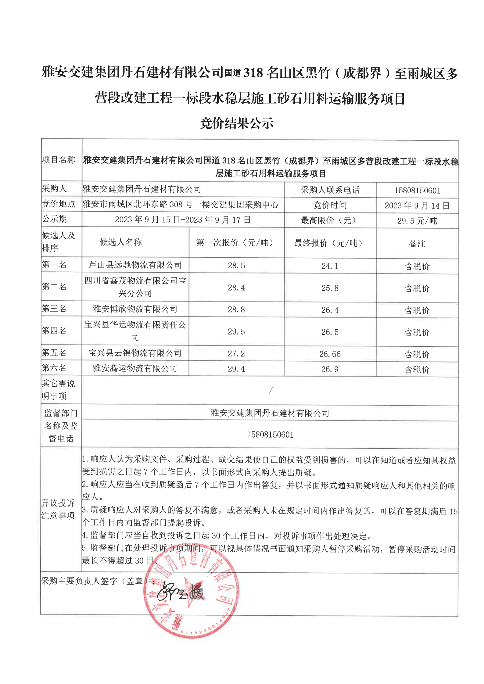 雅安交建集團(tuán)丹石建材有限公司國道318名山區(qū)黑竹(成都界)至雨城區(qū)多營段改建工程一標(biāo)段水穩(wěn)層施工砂石用料運(yùn)輸服務(wù)項目競價結(jié)果公示