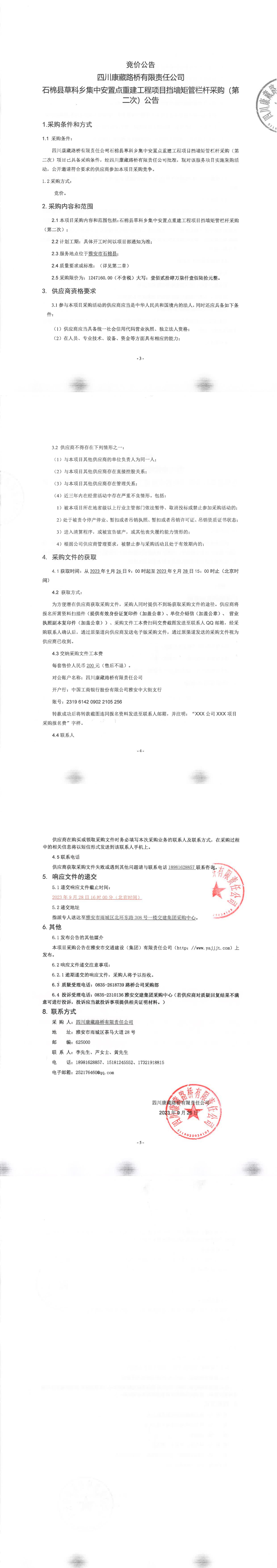 四川康藏路橋有限責(zé)任公司石棉縣草科鄉(xiāng)集中安置點(diǎn)重建工程項(xiàng)目擋墻矩管欄桿采購(gòu)(第二次)公告