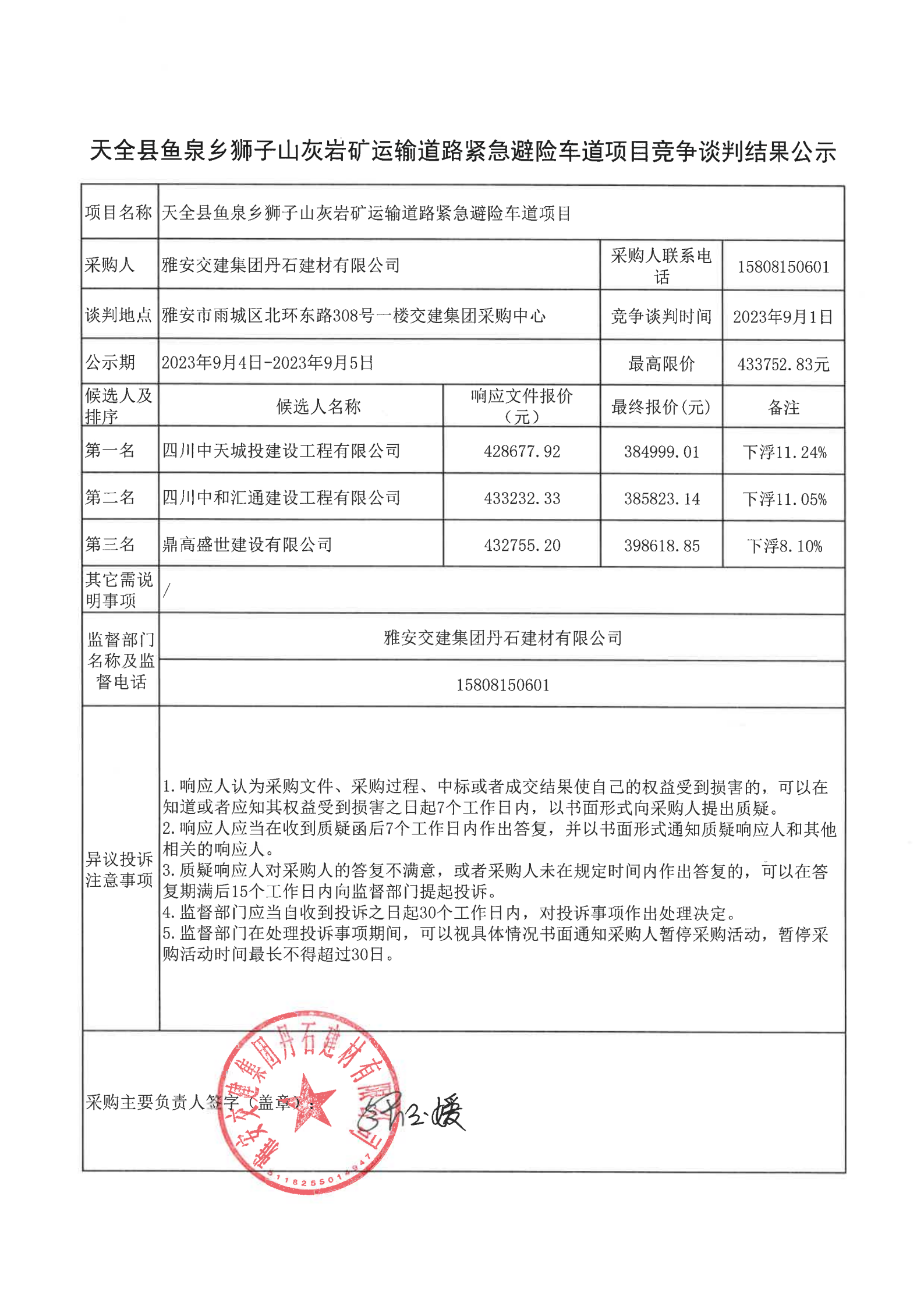 雅安交建集團(tuán)丹石建材有限公司天全縣魚泉鄉(xiāng)獅子山灰?guī)r礦運(yùn)輸?shù)缆肪o急避險(xiǎn)車道項(xiàng)目競爭談判結(jié)果公示