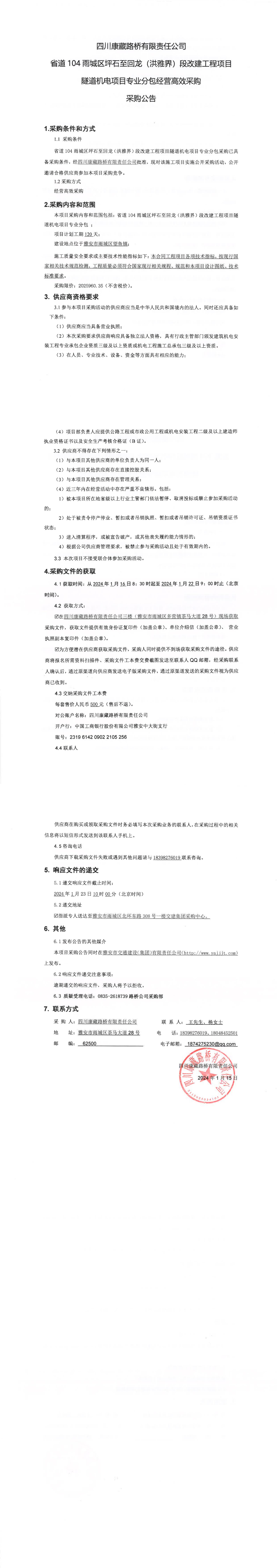 四川康藏路橋有限責(zé)任公司省道104雨城區(qū)坪石至回龍(洪雅界)段改建工程項目隧道機(jī)電項目專業(yè)分包經(jīng)營高效采購公告