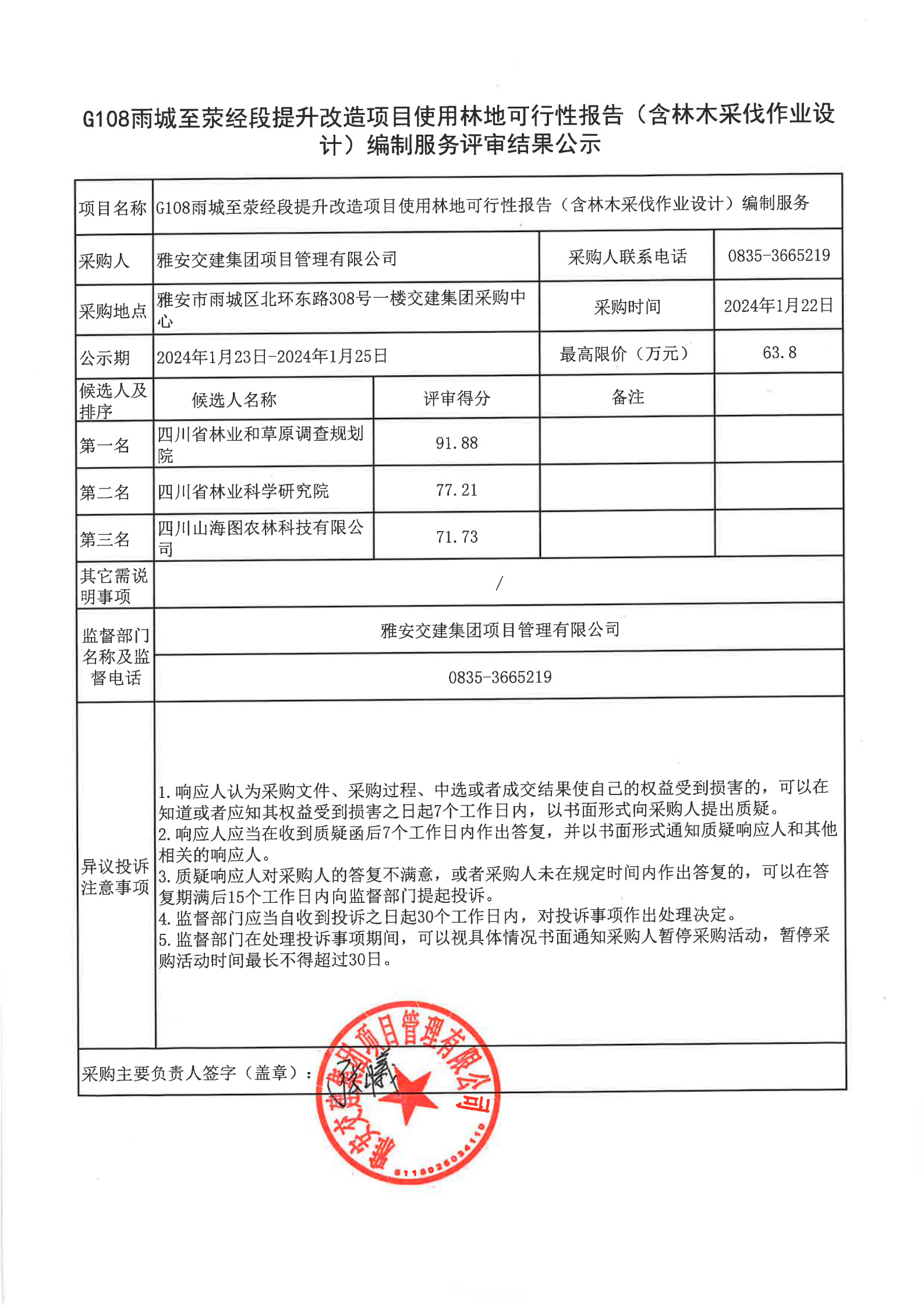 雅安交建集團項目管理有限公司G108雨城至滎經(jīng)段提升改造項目使用林地可行性報告(含林木采伐作業(yè)設計)編制服務評審結(jié)果公示