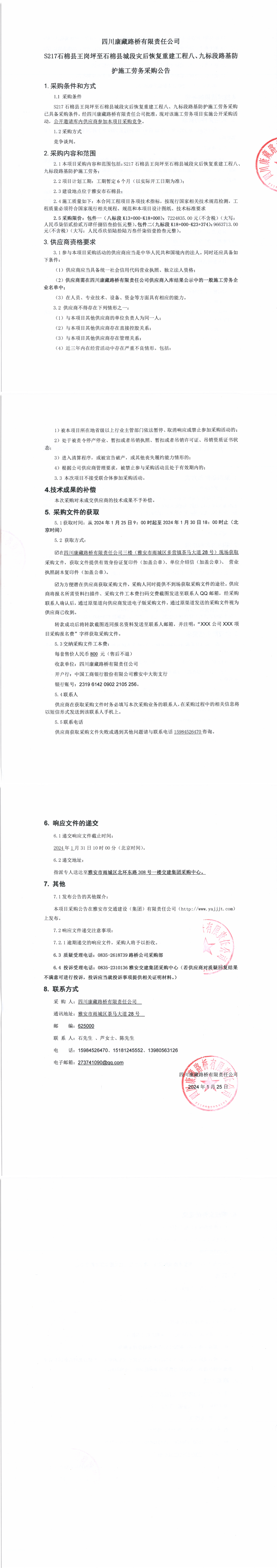 四川康藏路橋有限責(zé)任公司S217石棉縣王崗坪至石棉縣城段災(zāi)后恢復(fù)重建工程八、九標(biāo)段路基防護(hù)施工勞務(wù)采購(gòu)公告